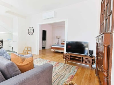 Apartamento térreo open space, mas muito acolhedor e cheio de caráter. Sente-se nas nossas namoradeiras (dois bancos graníticos integrados na parede, frente a frente, junto à janela), traço de antiguidade, e deixe-se envolver no romance enquanto desfruta de uma bebida.
